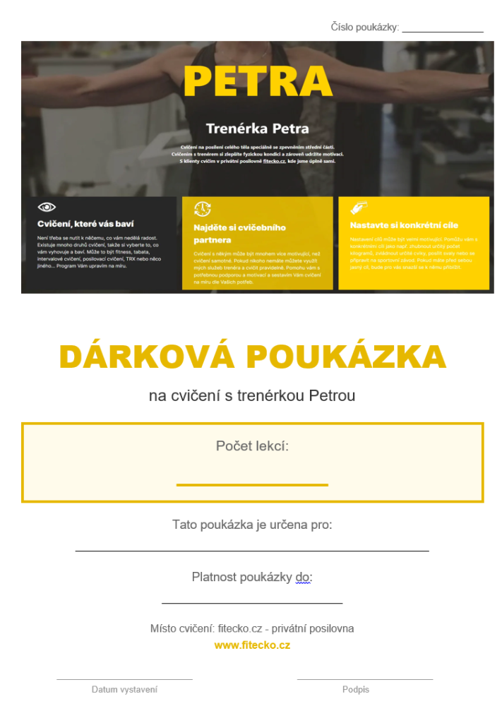 Dárková poukázka na cvičení s trenérkou Petrou je perfektní volba pro každého, kdo chce: